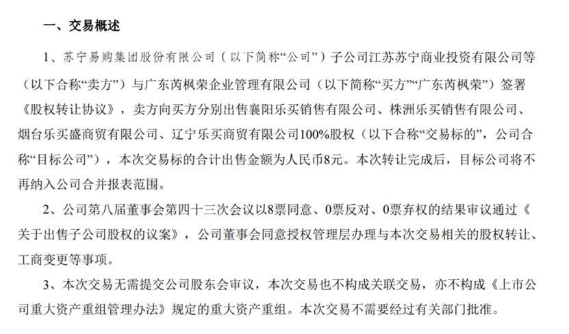该公告表示,公司子公司江苏苏宁商业投资有限公司等与广东芮枫荣企业管理有限公司签署股权转让协议,出售襄阳乐买、株洲乐买、烟台乐买盛及辽宁乐买四家公司100%股权。而交易对价极具戏剧性:每家公司售价2元,合计出售金额仅为人民币8元。
