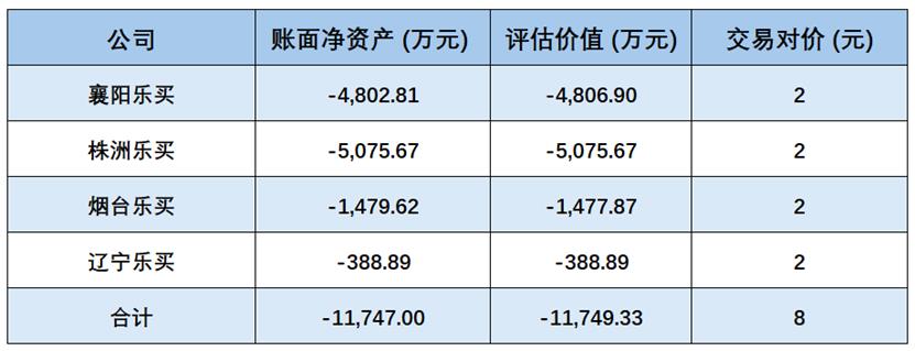 这四家标的公司的共同点在于严重的“资不抵债”。评估数据显示,截至基准日,这四家公司的账面净资产合计亏损约1.17亿元。其中,株洲乐买与襄阳乐买的评估负债均超过4800万元,烟台乐买负债约1478万元,辽宁乐买负债约389万元。