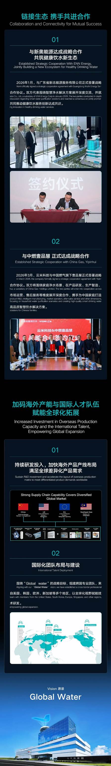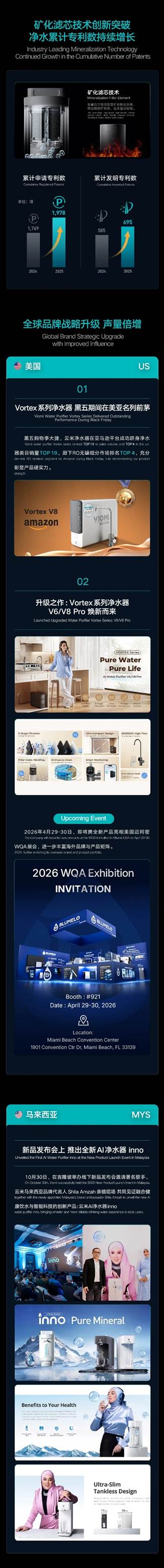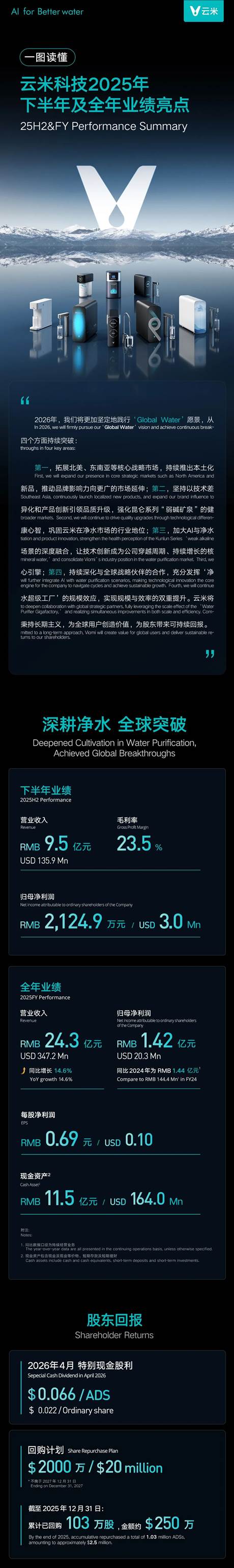 深耕净水,国内海外双轮驱动。云米科技2025年下半年及全年业绩正式发布。全年总收入24.3亿元,同比增长14.6%;归母净利润1.42亿元,持续盈利,经营底盘稳健;特别现金股利0.066美元/ADS,持续提升股东价值。稳步推进 “Global Water” 战略,海外市场增长势能持续释放。