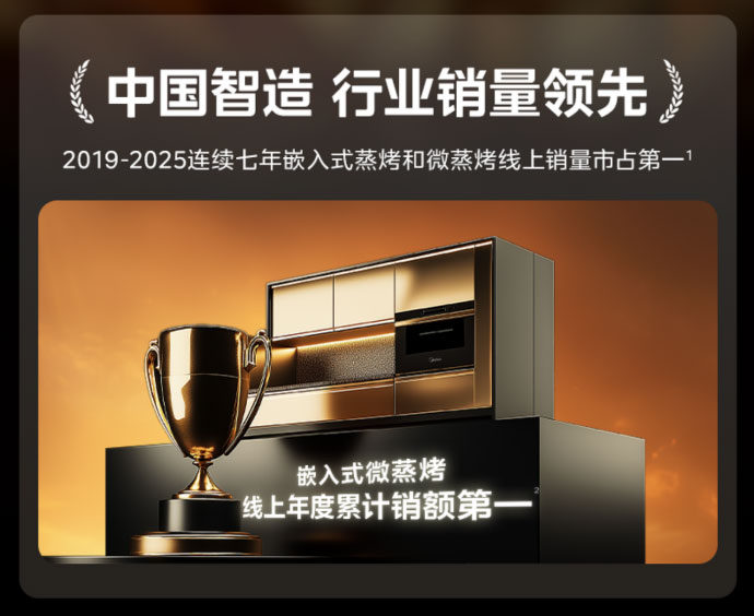 在这一背景趋势下,美的持续深耕厨房电器技术研发,不断夯实科研与产业基础。根据奥维云网统计,2019年至2025年,美的嵌入式蒸烤和微蒸烤产品线上销量连续七年位居行业第一;在微波炉领域,美的微波核心技术行业效率第一,还斩获工信部国家级磁控管“制造业单项冠军”称号。