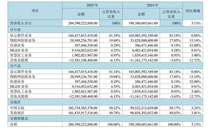 京东方A全年实现营收2045.9亿元,同比增长3.13%,归母净利润58.57亿元,同比增长10.03%,盈利质量稳步提升。显示器件业务仍是业绩“压舱石”,贡献超八成营收,LCD五大主流领域及车载应用面板出货量连续多年全球领先,柔性OLED出货量亦稳步增长。值得关注的是,物联网创新业务营收同比增长15.14%至389.49亿元,正成长为新的业绩增长引擎,显示“1+4+N+生态链”战略架构正加速落地。