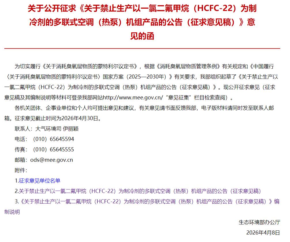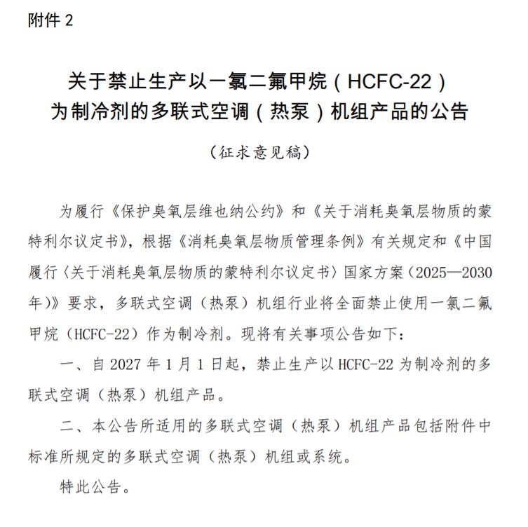 近日,生态环境部发布《关于禁止生产以一氯二氟甲烷(HCFC-22)为制冷剂的多联式空调(热泵)机组产品的公告(征求意见稿)》。其中提到,根据《消耗臭氧层物质管理条例》有关规定和《中国履行〈关于消耗臭氧层物质的蒙特利尔议定书〉国家方案(2025—2030年)》要求,多联式空调(热泵)机组行业将全面禁止使用一氯二氟甲烷(HCFC-22)作为制冷剂。自2027年1月1日起,禁止生产以HCFC-22为制冷剂的多联式空调(热泵)机组产品。