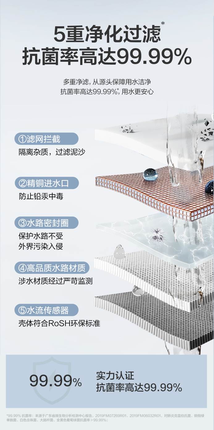 用水健康,是家庭沐浴最基础也最核心的底线。16L5搭载5重净化过滤系统,从进水源头到出水终端,全方位筑牢用水安全防线:第一层滤网拦截,高效隔离杂质、过滤泥沙,从源头拦截水体污染物;第二层精铜进水口,杜绝铅汞析出,从根源避免重金属污染;第三层水路密封圈,严密阻隔外界污染入侵,守护水路洁净;第四层高品质水路材质,涉水部件经过严苛监测,安全无隐患;第五层水流传感器,壳体符合RoSH环保标准,进一步保障用水健康。整套系统实现高达99.99%的抗菌率,让每一滴出水都洁净安心。
