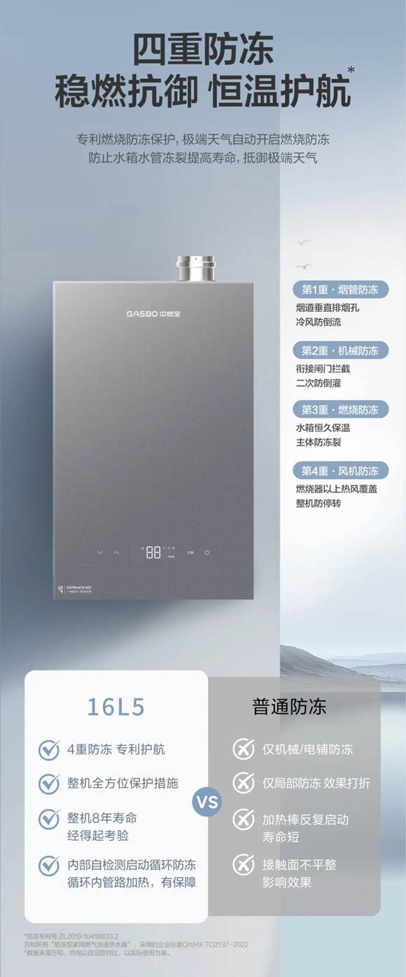 一到冬天,不少家庭的热水器就开始“闹脾气”:低温天容易冻堵、冻裂,洗到一半突然没热水,甚至机器直接罢工。16L5解决了低温天的用水焦虑,用四重专利防冻系统,给热水器穿上了“保暖铠甲”。