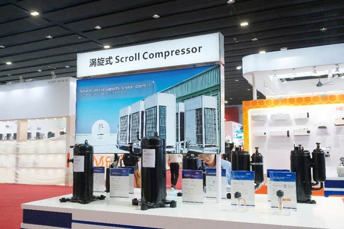 除家用空调外,美芝现场还展示了应用于T3工况(适用于最高环境温度52°C的热带气候)的家用及商用领域的转子式压缩机、涡旋式压缩机等产品。如针对中东等高温干燥地区的严苛运行环境,美芝针对性推出中东分体空调涡旋压缩机。在高温环境下,该压缩机制冷能力显著优于常规活塞机型,能效比高出6%~8%,保障用户在酷热季节的拥有舒适体验。