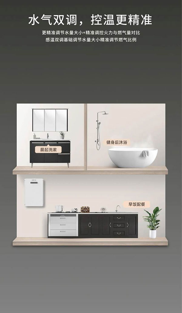 而16S9刚好解决了这份顾虑,0.3℃智能双控温设计响应更快、控温更精准,再加上水气双调的贴心配置,精准调节水量大小+精准调控火力与燃气量比例,不管是水压波动,还是用气高峰,不管是一人独享,还是全家同时用水,水温都能稳稳保持一致。