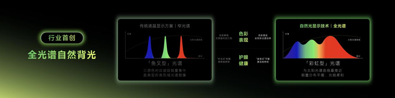 盯着屏幕看久了,只要抬头看看窗外自然景色,眼睛瞬间就舒服多了,这是因为真实环境下的自然光是柔和的、有“呼吸感”的,其光谱形态是连续波浪式曲线的「彩虹型」;但电视等电子设备发出的光是人造光,虽然能带来鲜艳的色彩表现,但它的光谱是尖锐的「鱼叉型」,会强烈刺激我们的视神经,往往一部好片子还没看多久,眼睛就会出现不适现象。而创维「自然光显示技术」采用了全光谱自然背光,在RGB三色背光外增加了“W”全光谱白光,能够使画面观感贴近真实的自然光,色彩显示更加柔和,观看体验更舒适。