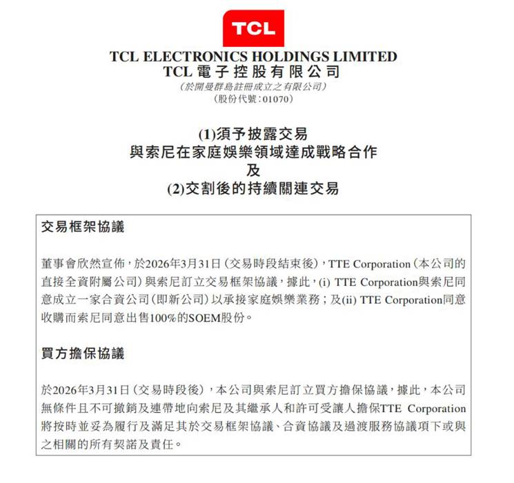 索尼在 2026 年 1 月与 TCL 电子成立合资公司,由 TCL 持股 51% 控股,全面接管日本及全球的电视研发、生产、销售,仅保留品牌授权。松下虽未完全退出,但也在 2024 年起寻求出售本土电视业务,2026 年 4 月更将北美、欧洲电视销售业务移交创维,仅在本土退守高端型号研发生产。