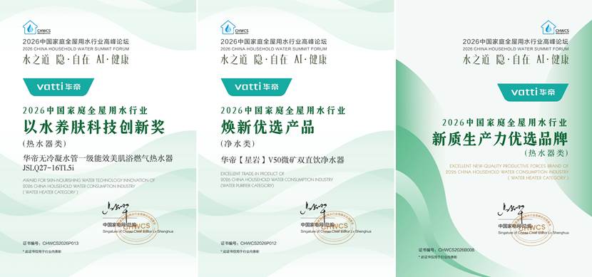 本届活动由中国家用电器协会指导,中国家电网主办,活动期间对行业发展做出突出贡献的企业以及引领行业趋势的标杆产品进行颁奖。高端厨电领导品牌华帝凭借在这一领域的深耕和创新,获评为“2026中国家庭全屋用水行业(热水器类)新质生产力优选品牌”;旗下高端产品“星岩V50微矿双直饮净水器”被评为“2026中国家庭全屋用水行业(净水类)焕新优选产品”,“无冷凝水管一级能效美肌浴燃气热水器JSLQ27-16TL5i”被评为“2026中国家庭全屋用水行业(热水器类)以水养肤科技创新奖”。