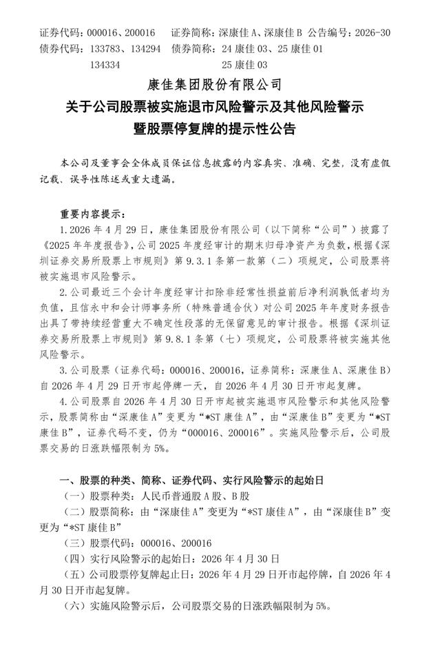 根据《深圳证券交易所股票上市规则》相关规定,公司股票交易将被实施退市风险警示和其他风险警示。公司公告称,股票自4月29日开市起停牌一天,自4月30日开市起复牌后,股票简称将由“深康佳A”“深康佳B”变更为“*ST康佳A”“*ST康佳B”。实施风险警示后,公司股票交易的日涨跌幅限制为5%。